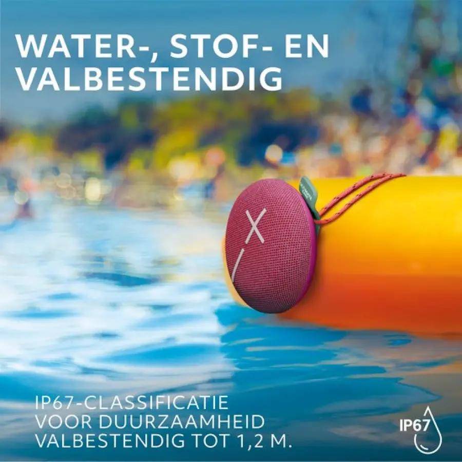 Met een IP67-classificatie is deze speaker bestand tegen stof en kan hij tot 30 minuten ondergedompeld worden in water tot 1 meter diep. Perfect voor bij het zwembad, op het strand of onder de douche. Ook als hij per ongeluk valt, overleeft hij dat tot een valhoogte van 1,2 meter.