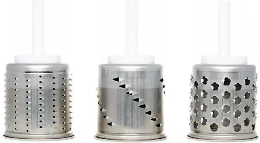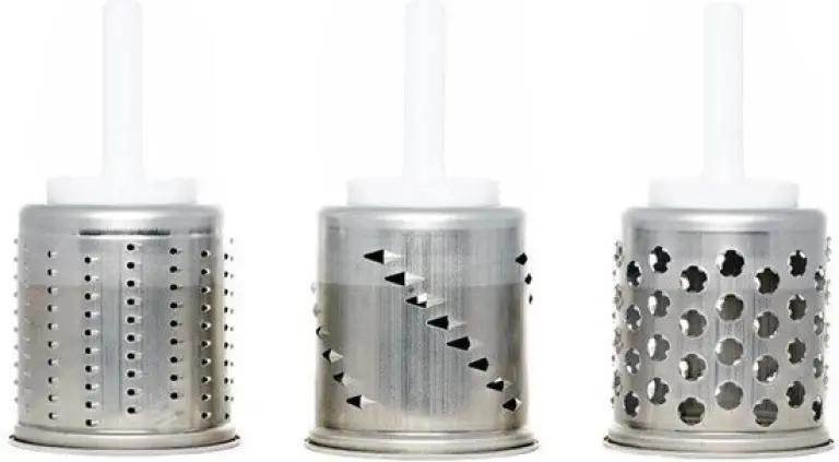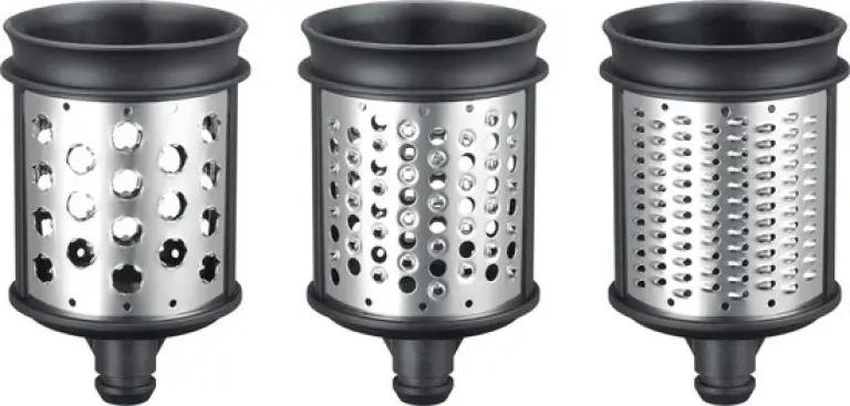 De set bevat een pureertrommel, ideaal om zachte ingrediënten glad te maken. Daarnaast vind je een reepjestrommel (Julienne), waarmee je snel en eenvoudig dunne reepjes snijdt voor bijvoorbeeld salades of groenten. Tot slot is er een fijne rasptrommel, perfect voor het raspen van kaas, chocolade of groenten.