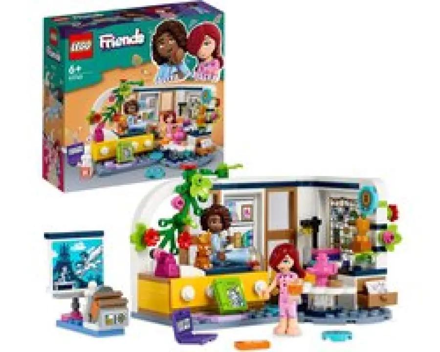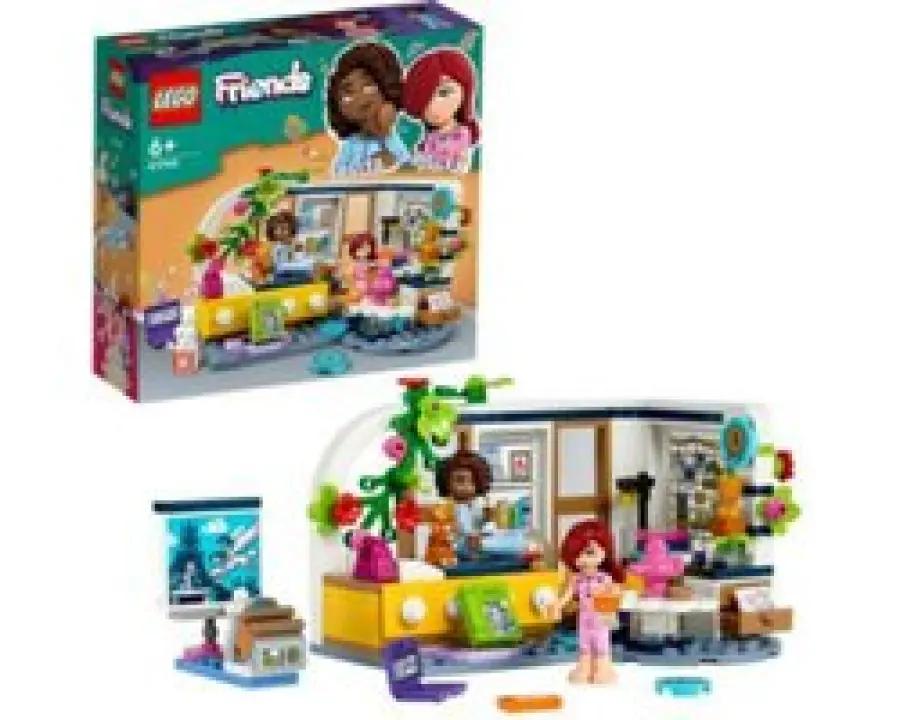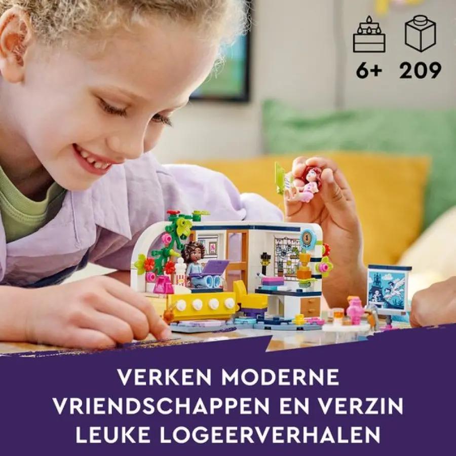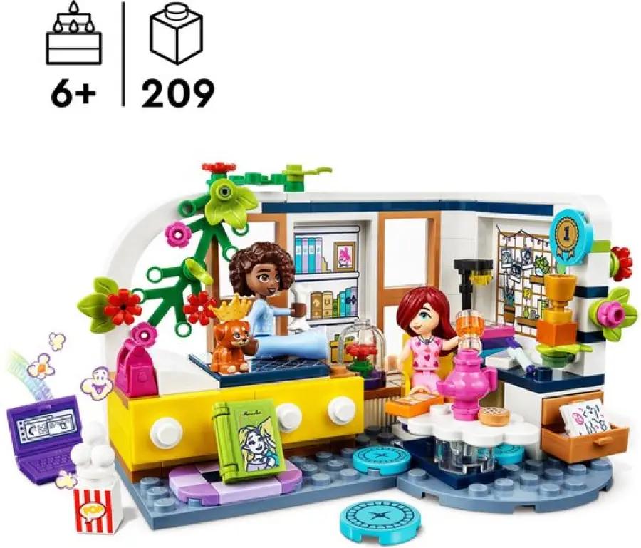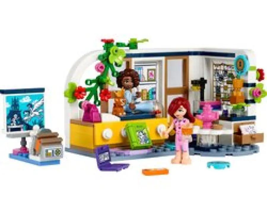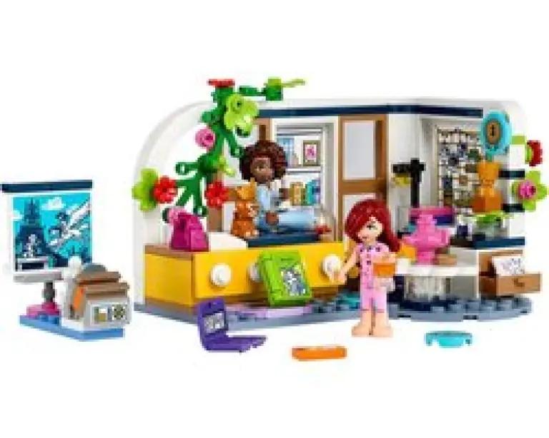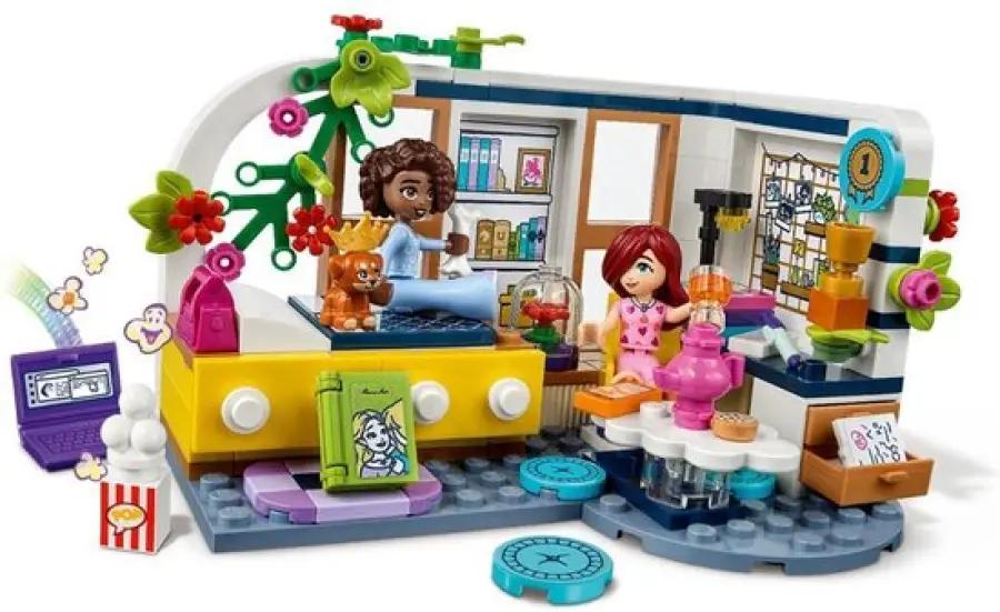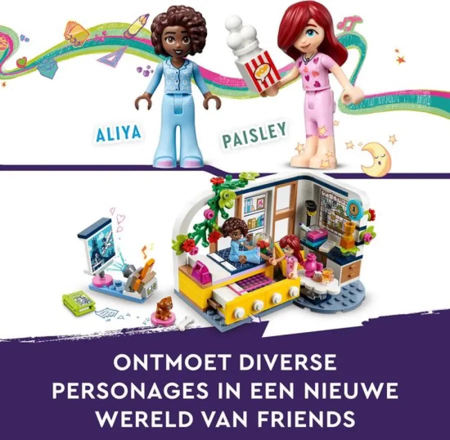 De LEGO Friends speelset bestaat uit een bouwbare slaapkamer vol details, plus 2 minipoppetjes van Aliya en Paisley, en een speelgoedhuisdier. De kamer weerspiegelt Aliya's leergierige aard met accessoires zoals schriften, een draaistoel, laptop, boek, lamp en trofee. Leuk detail: het werkstuk waar Aliya een onvoldoende voor kreeg en dat ze heeft verstopt onder haar stapel tienen! Misschien kan Paisley haar helpen om niet zo streng voor zichzelf te zijn. Als het tijd is om te ontspannen, is er een groot scherm om films te kijken en hondenaccessoires om met Aliya's puppy te spelen.