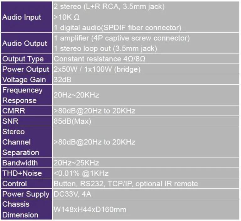 De Vivolink VL120005 audio versterker levert een indrukwekkend vermogen van 2x50 watt per kanaal. Deze 2.0 kanaals versterker is ideaal voor thuisgebruik en zorgt voor een heldere en krachtige geluidsweergave. Dankzij de klasse D versterker technologie geniet je van een efficiënte en kwalitatieve audio-ervaring zonder onnodig stroomverbruik.