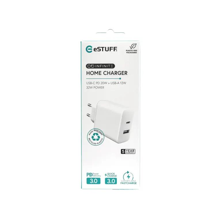 De eSTUFF ES637031 is dé oplader die jouw smartphone en andere mobiele apparaten snel en efficiënt voorziet van stroom. Met maar liefst twee poorten, waaronder een USB-C Power Delivery (PD) van 20W en een USB-A van 12W, laad je gelijktijdig je apparaten zonder gedoe. Dankzij de ondersteuning van Quick Charge 3.0 technologie gaat het opladen extra snel en veilig.