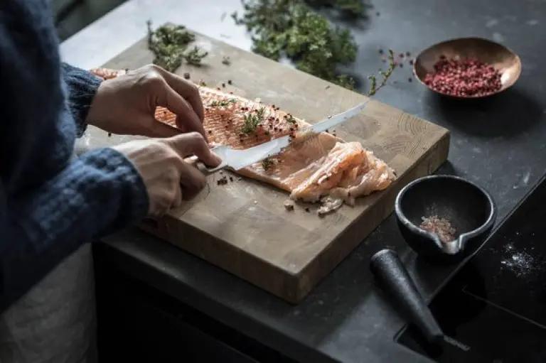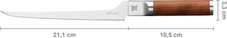 De handgreep van het fileermes is gemaakt van hittebehandeld Fins berkenhout, wat niet alleen een natuurlijke en warme uitstraling geeft, maar ook zorgt voor een comfortabele grip. Het ergonomische ontwerp maakt het mes prettig in gebruik, waardoor je precisiewerk moeiteloos uitvoert zonder vermoeide handen.