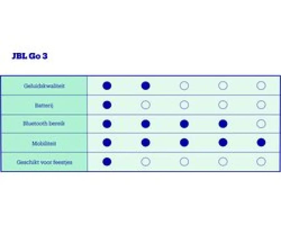| Verpakkingsinhoud | 1 x JBL Go 3 1 x Type C USB cable 1 x Quick start guide 1 x Warranty card 1 x Safety sheet |