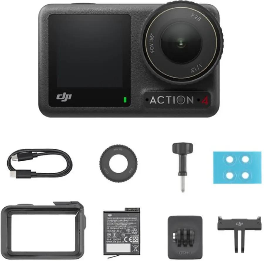 Verpakkingsinhoud Osmo Action 4, Osmo Action Extreme Battery, Osmo Action Horizontal-Vertical Protective Frame, Osmo Action Quick-Release Adapter Mount, Osmo Action Curved Adhesive Base, Osmo Locking Screw, Type-C to Type-C PD Cable, Osmo Action Lens Hood, Osmo Action Anti-Slip Pad, DJI Logo Sticker, Quick Start Guide, Disclaimer Warranty Card
