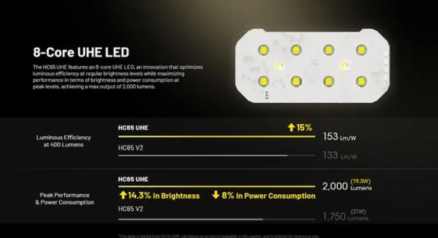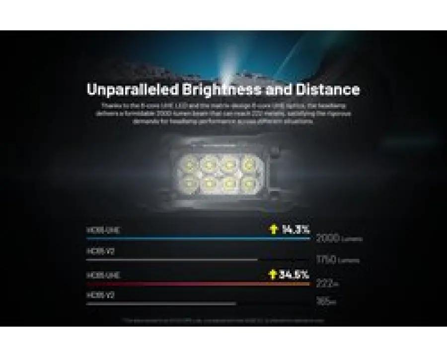 De Nitecore HC65 UHE hoofdlamp tilt jouw verlichting naar een hoger niveau. Dankzij de Ultra High Efficiency (UHE) LED technologie geeft deze lamp een krachtige lichtopbrengst van maar liefst 2000 lumen met een indrukwekkende straalafstand van 222 meter. Dit betekent dat je zelfs in het donker een helder en breed zicht hebt, ideaal voor hiken, kamperen, klimmen en professioneel gebruik.