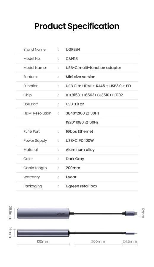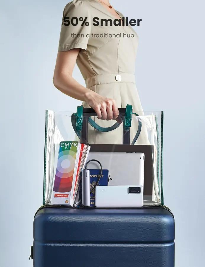 De UGREEN 10919 laptop dock is een ultradunne 5-in-1 USB-C-hub die jouw laptop uitbreidt met handige poorten. Deze hub is uitgevoerd in een stevige aluminium behuizing in een stijlvolle grijze kleur. Met zijn compacte formaat van 122 mm diep, 26,3 mm breed en slechts 17,6 mm hoog neem je hem makkelijk mee of plaats je hem op je bureau zonder gedoe.