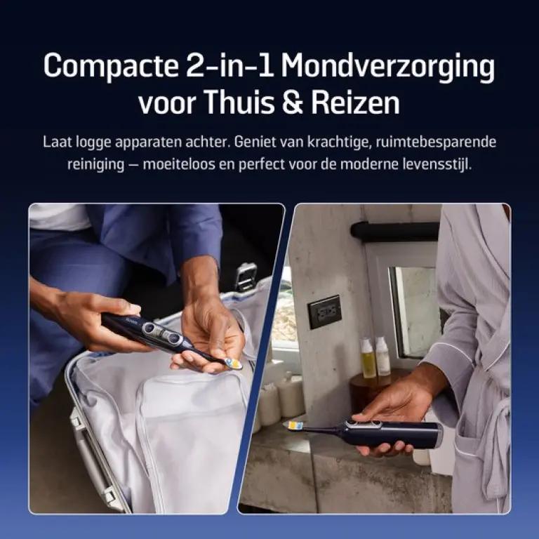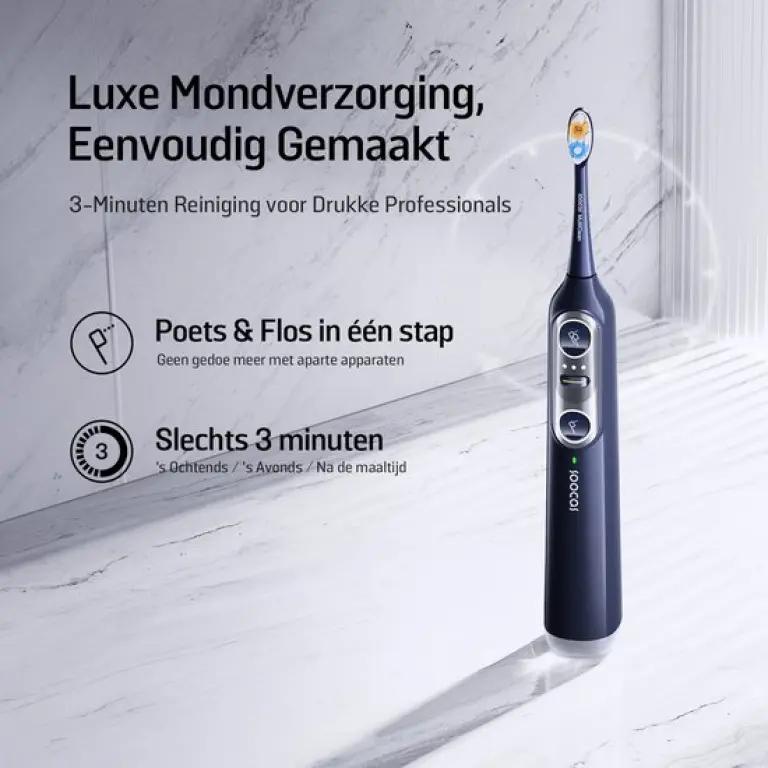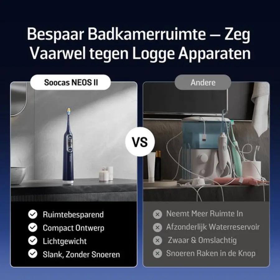 De Soocas NEOS II combineert een elektrische tandenborstel en waterflosser in één slank en compact apparaat. Dit betekent minder rommel op je wastafel en een eenvoudiger, effectiever mondverzorgingsritueel. Geen gedoe meer met aparte apparaten, maar een alles-in-één oplossing die moeiteloos past in jouw dagelijkse routine.