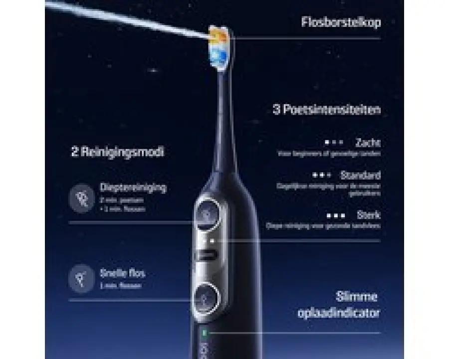 Kies uit twee reinigingsmodi: de diepe reinigingsmodus voor een grondige verzorging en de snelle flosmodus voor een snelle opfrissing. Met drie intensiteitsniveaus pas je de reiniging aan jouw wensen en gevoeligheid aan, van zacht tot krachtig. Jij bepaalt hoe je jouw mond het beste verzorgt.