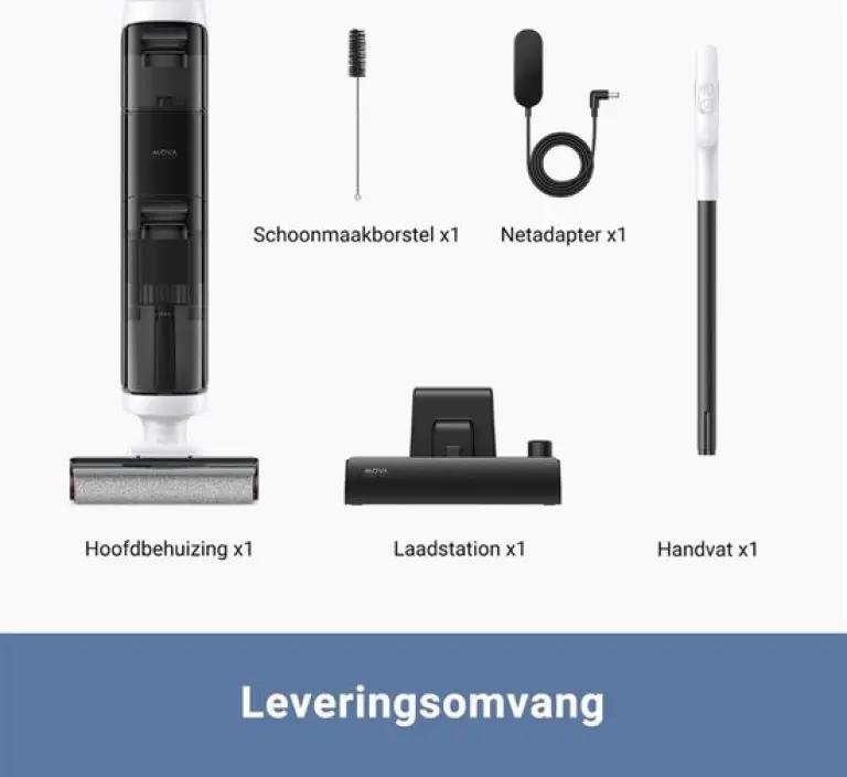 | Verpakkingsinhoud | 1x Dreame Mova K20, 1x Schoonmaakborstel, 1x Netadapter, 1x Laadstation, 1x Handvat |
