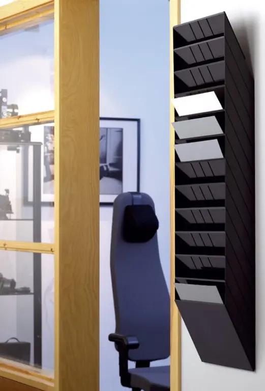 Deze tijdschrifthouder heeft een slank en compact formaat van 105 cm hoog, 35 cm breed en 9,5 cm diep. Dankzij de zwarte kleur past hij makkelijk in verschillende omgevingen, van kantoor tot wachtruimte. Het ontwerp is eenvoudig maar functioneel, zonder onnodige fratsen.