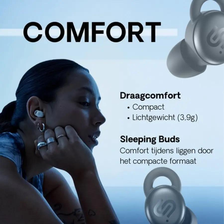 De Urbanista Porto draadloze oordopjes zijn gemaakt met jouw comfort in gedachten, vooral als je ze gebruikt tijdens het slapen. Dankzij de kussenveilige pasvorm liggen ze zelfs comfortabel als je op je zij ligt. De meegeleverde siliconen eartips en wings in drie maten zorgen voor een perfecte en veilige pasvorm die irritatie voorkomt, ook tijdens lange nachten. Met instelbare slaaptimers van 30, 60 of 90 minuten kun je ontspannen in slaap vallen terwijl je geniet van je favoriete muziek of podcasts.