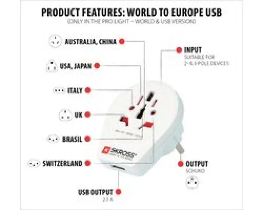 Deze adapter ondersteunt zowel 2-polige als 3-polige stekkers, zowel geaard als ongeaard. Hierdoor kun je eenvoudig apparaten uit diverse landen gebruiken. Daarnaast beschikt de adapter over een geïntegreerde USB Type-A poort waarmee je USB-apparaten tegelijk kunt opladen. Zo hoef je niet meerdere adapters mee te nemen, wat ruimte en gewicht bespaart tijdens het reizen.
