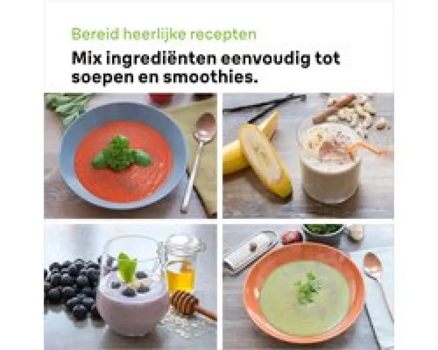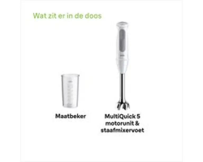 | Verpakkingsinhoud | Staafmixer, maatbeker, hakmolen, garde, mini pureervoet en handleiding |