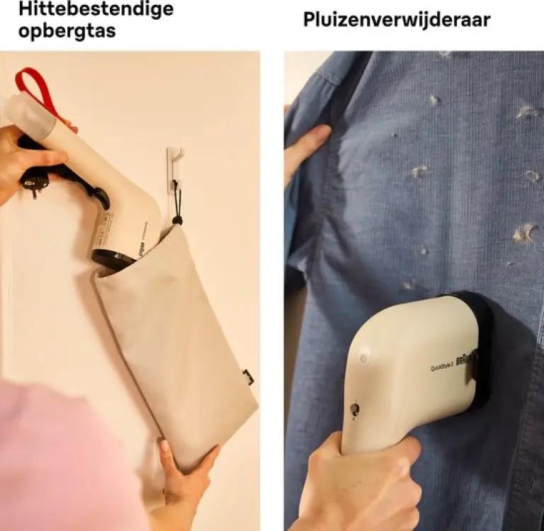 De Braun QuickStyle 3 wordt geleverd met een pluizenverwijderaar die stof en haren effectief van je kleding verwijdert. Ook krijg je een hittebestendige opbergtas mee, ideaal om de stomer veilig mee te nemen tijdens je reizen. Binnen 30 seconden is het apparaat klaar voor gebruik dankzij de snelle opwarmtijd.