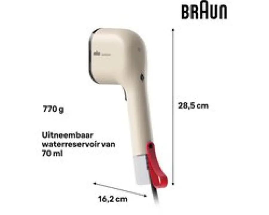 Deze handstomer is speciaal ontworpen om compact en licht te zijn. Met een gewicht van slechts 0,77 kg en een strak design neem je hem makkelijk mee in je handbagage. Thuis berg je hem eenvoudig op dankzij het kleine formaat. Daarnaast zorgt het uitneembare waterreservoir van 70 ml met brede opening ervoor dat bijvullen snel en schoon gaat.