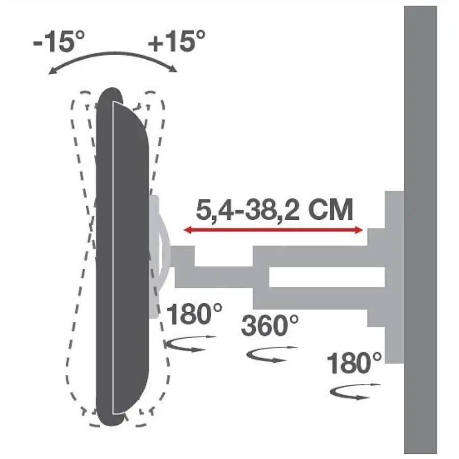 Deze beugel geeft je veel bewegingsvrijheid: je kunt je scherm kantelen van -15 tot 15 graden, horizontaal draaien tot 180 graden en zelfs volledig draaien met een draaihoek van 360 graden. Zo vind je altijd de ideale kijkhoek, of je nu recht voor je scherm zit of vanaf de zijkant kijkt. De afstand tot de muur is variabel van 5,4 cm tot 38,2 cm, waardoor je de tv strak tegen de muur kunt plaatsen of juist iets verder naar voren kunt trekken voor meer flexibiliteit.