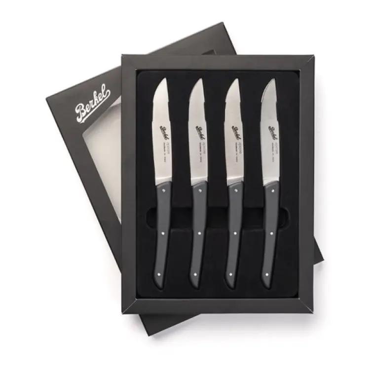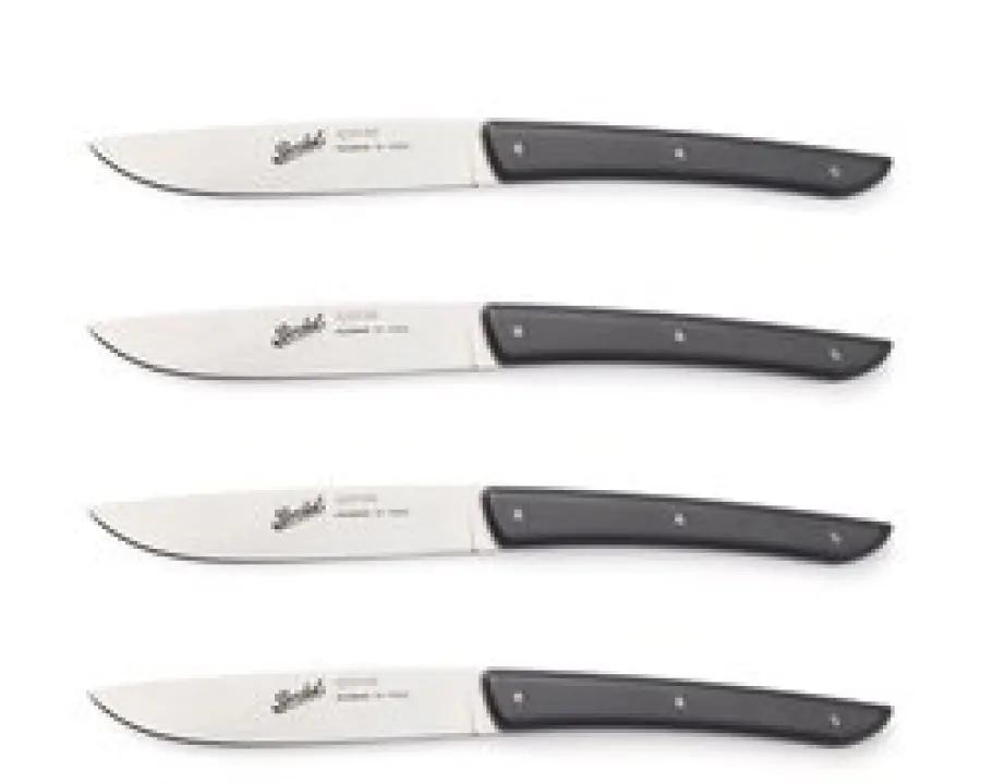 Met deze 4-delige steakmessenset van Berkel snijd je vlees moeiteloos en netjes. De set bestaat uit vier steakmessen met een stijlvol mat zwart handvat en een glad roestvrijstalen lemmet. Dankzij de scherpe punt en rand snijd je precies door geroosterd vlees zonder dat het gaat rafelen. Dit maakt je diner nét wat specialer en zorgt voor een professionele uitstraling aan tafel.