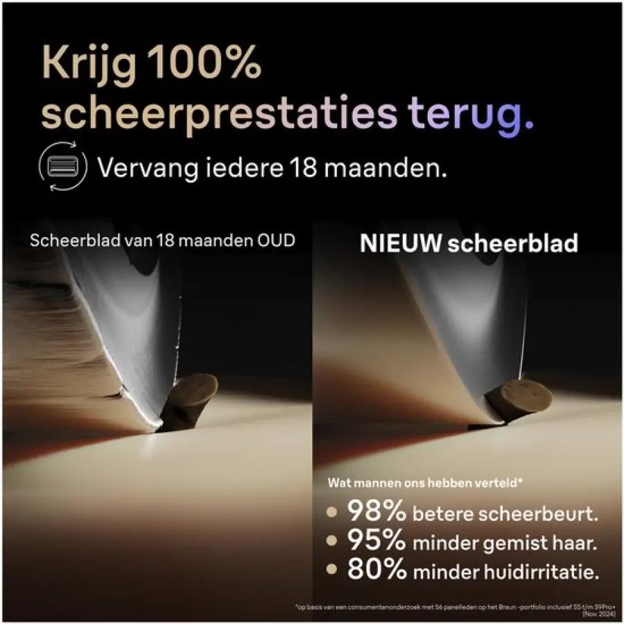 Het gemiddelde Braun scheerapparaat snijdt 6 miljoen haren elke 18 maanden. Dit betekent dat de scheerkop geleidelijk zal slijten en je scheerbeurt minder nauwkeurig en comfortabel kan worden. Daarom raadt Braun aan om elke 18 maanden de folie en het snijblok van je scheerapparaat te vervangen om je scheerapparaat weer in topconditie te krijgen. Zorg voor je scheerapparaat, en het zal voor jou zorgen.