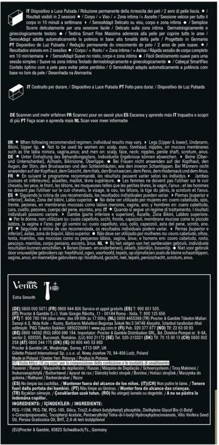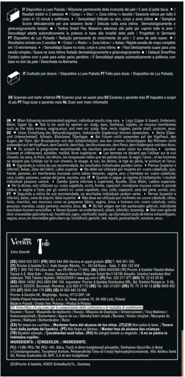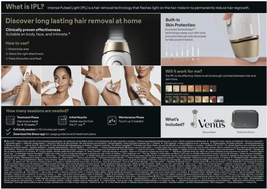 | Verpakkingsinhoud | Braun IPL-apparaat met Smart Flex-kop, 4 koppen, etui, Gillette Venus scheersysteem (model kan variëren) |