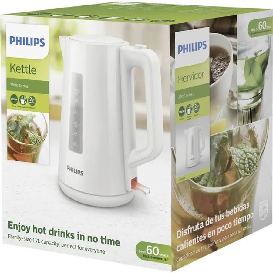 Met de Philips Series 3000 HD9318/00 waterkoker kook je in een handomdraai water voor thee, koffie of andere warme dranken. Deze witte waterkoker heeft een royale inhoud van 1,7 liter, ideaal voor meerdere kopjes tegelijk. Dankzij het automatische deksel dat soepel opent en het handige indicatielampje, weet je precies wanneer je apparaat aanstaat en klaar is voor gebruik.