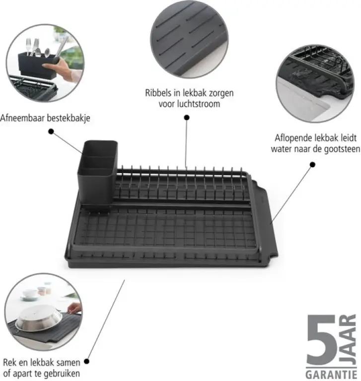 Het afdruiprek is vervaardigd uit corrosiebestendige aluminium materialen, waardoor het roestvrij en slijtvast is. Dit zorgt niet alleen voor een lange levensduur, maar ook voor een stijlvolle look die lang mooi blijft. Brabantia geeft maar liefst 5 jaar garantie op dit product, wat de kwaliteit en duurzaamheid onderstreept.