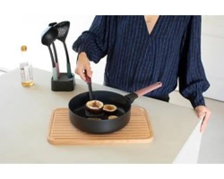 Met de Brabantia Tasty+ kookgerei set houd je je favoriete keukenhulpen altijd binnen handbereik. Deze slimme set bestaat uit een handige houder en vier multifunctionele keukenhulpjes: een soeplepel met schraper, een opscheplepel met spatel, een schuimspaan met lepel en een spatel. Zo heb je een winnend team dat koken makkelijker en leuker maakt.