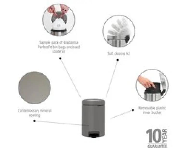 De NewIcon serie van Brabantia biedt pedaalemmers in verschillende maten, van klein (3 en 5 liter) tot groot (tot 30 liter), zodat er altijd een passende afvalemmer is voor elke kamer in huis. Sinds 1919 staat Brabantia bekend om stijlvolle, functionele en duurzame huishoudproducten die het dagelijks leven nét even makkelijker maken.
