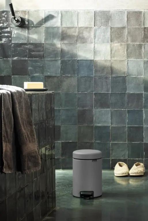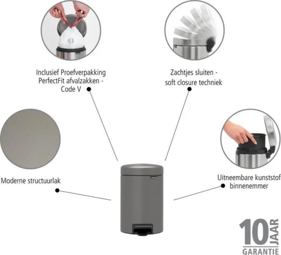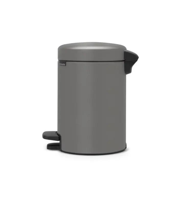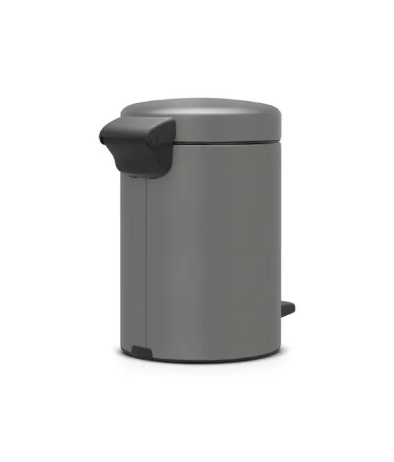 De Brabantia 126260 is een compacte prullenbak met een inhoud van 3 liter, perfect voor kleine ruimtes zoals de badkamer of het toilet. Deze ronde afvalemmer is uitgevoerd in een elegante Mineral Concrete Grey kleur met een mooie structuurlak die de buitenkant een fraaie glinsterende afwerking geeft. Dankzij het roestvrijstalen pedaal bedien je de prullenbak superlicht en geruisloos, wat extra gebruiksgemak biedt.