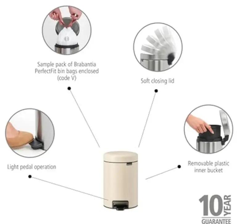 Bij aanschaf ontvang je een proefverpakking Brabantia PerfectFit afvalzakken (code V), die perfect passen en gemakkelijk onzichtbaar aan te brengen zijn. De NewIcon serie biedt ook andere maten en kleuren, zodat je altijd een passende prullenbak vindt voor elke ruimte in huis.