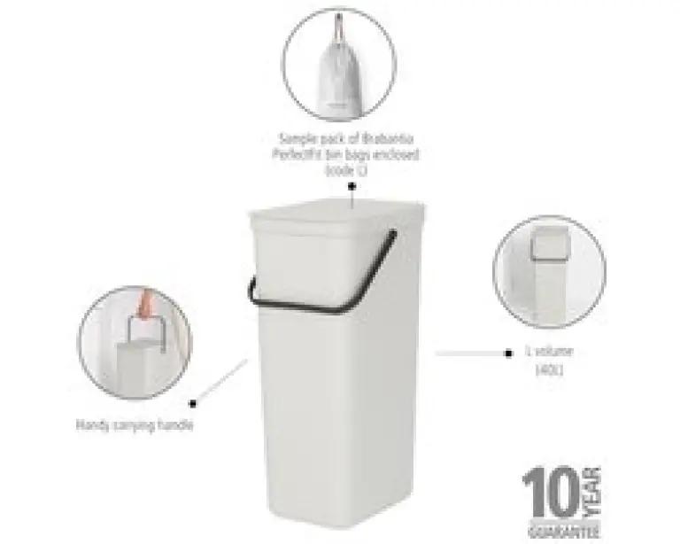 De Sort & Go collectie van Brabantia staat bekend om zijn duurzaamheid. Deze afvalemmer is Cradle-to-Cradle gecertificeerd op niveau Zilver, wat betekent dat hij milieuvriendelijk geproduceerd is. Daarnaast krijg je maar liefst 10 jaar garantie en service bij dit product. De afvalbak is voorzien van een deksel, is luchtdicht en anti-slip, wat zorgt voor hygiëne en stabiliteit. De afvalemmer wordt geleverd inclusief een proefverpakking Brabantia PerfectFit afvalzakken (code L), die je gemakkelijk en netjes kunt bevestigen.