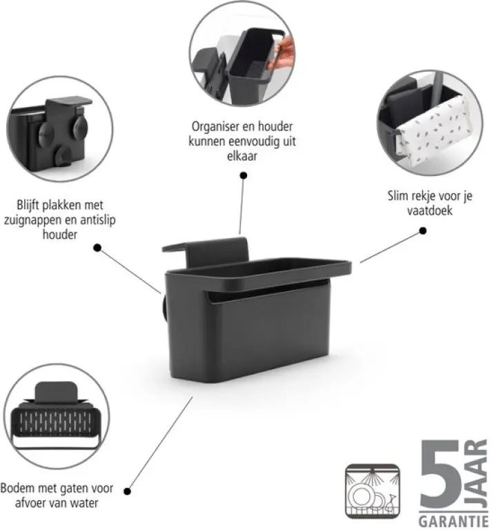 Deze organizer is gemaakt van corrosiebestendig kunststof, wat zorgt voor een lange levensduur en weinig onderhoud. Brabantia staat bekend om kwaliteit en duurzaamheid, en daarom krijg je 5 jaar garantie op dit product. Let wel op dat de organizer niet geschikt is voor gebogen spoelbakken of oneffen, gecoate oppervlakken.