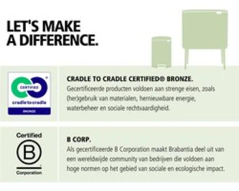 Brabantia is lid van het Cradle-to-Cradle®-programma en werkt actief aan een circulaire toekomst. Veel producten zijn gemaakt van gerecyclede materialen en volledig recyclebaar. Zo kies je niet alleen voor kwaliteit, maar ook voor een schonere wereld.