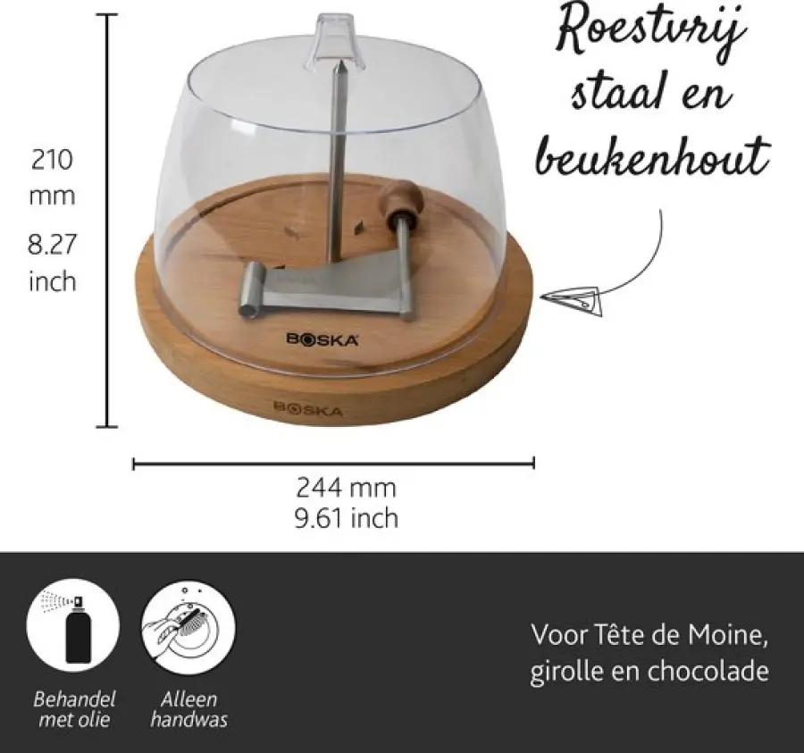 Na gebruik plaats je de stolp over de kaaskruller om de aroma's van de kaas of chocolade te behouden en de versheid langer te bewaren. De kaaskruller is makkelijk uit elkaar te halen voor een snelle reiniging, en kan veilig in de vaatwasser. Zo houd je alles eenvoudig schoon zonder gedoe. Dankzij de stevige houten constructie en het gebruiksvriendelijke ontwerp geniet je jarenlang van dit handige keukengereedschap.