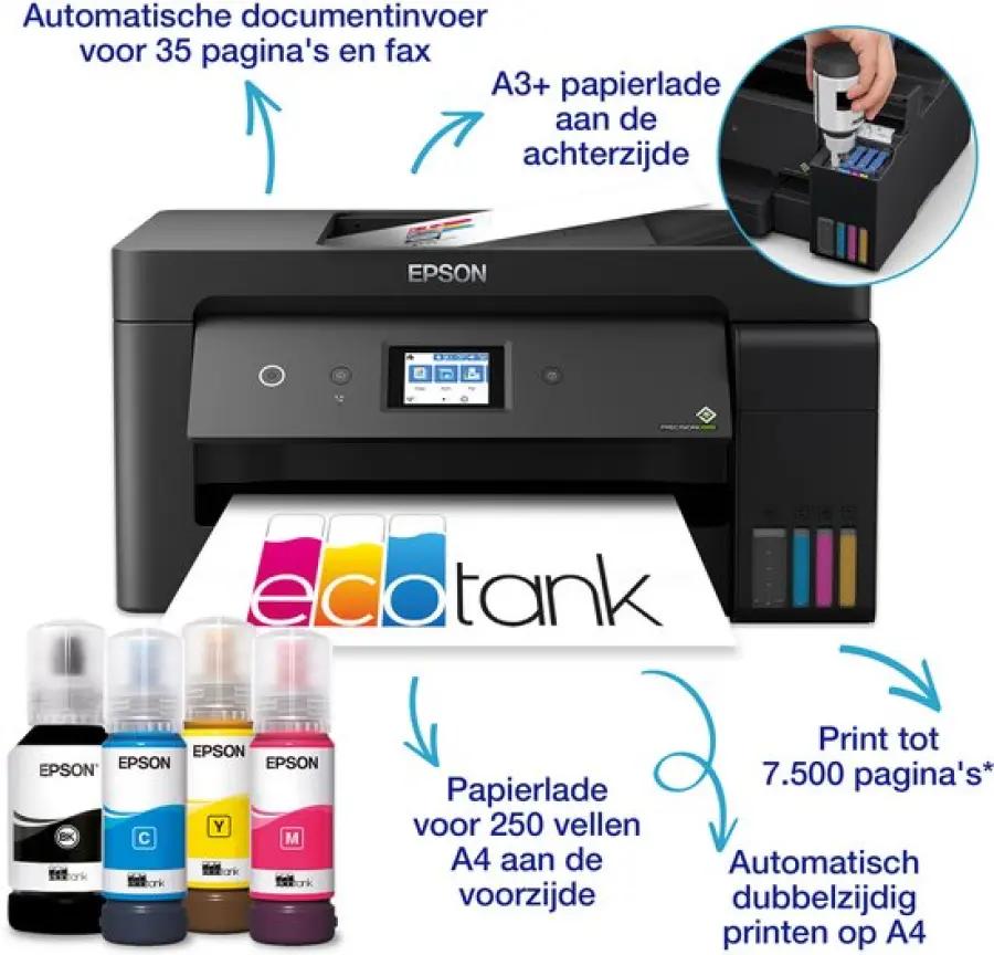 De Epson EcoTank ET-15000 is een multifunctionele inkttankprinter die je laat printen, scannen, kopiëren én faxen, met het gemak van een compact model. Deze printer kan afdrukken tot A3+-formaat, ideaal voor grotere documenten of creatieve projecten, terwijl hij toch makkelijk een plekje vindt in je thuiskantoor. Dankzij het gebruiksvriendelijke touchscreen bedien je de printer eenvoudig zonder pc.