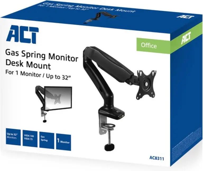 De ACT AC8311 is een stevige bureausteun gemaakt van metaal, speciaal ontworpen voor één monitor tot maximaal 32 inch en 9 kg. Dankzij het gasveersysteem kun je het beeldscherm met één hand eenvoudig in hoogte en diepte verstellen. Dit maakt het ideaal om de juiste kijkhoek en hoogte te vinden voor een comfortabele en gezonde werkhouding.