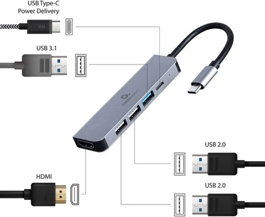 Met de Gembird A-CM-COMBO5-03 beschik je over meerdere aansluitingen. Zo vind je er een HDMI-poort voor het aansluiten van je monitor of tv, twee USB 2.0 poorten voor je randapparatuur en een snelle USB 3.2 poort voor snelle dataoverdracht. Dit maakt het een veelzijdige hub die aan al je wensen voldoet.