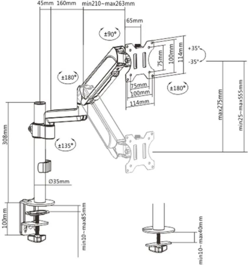 De monitorarm is traploos in hoogte verstelbaar en ondersteunt VESA-bevestigingsmaten van 100 x 100 mm en 75 x 75 mm. Dit zorgt voor een brede compatibiliteit met verschillende schermen en een optimale aanpassing aan jouw werkhouding.