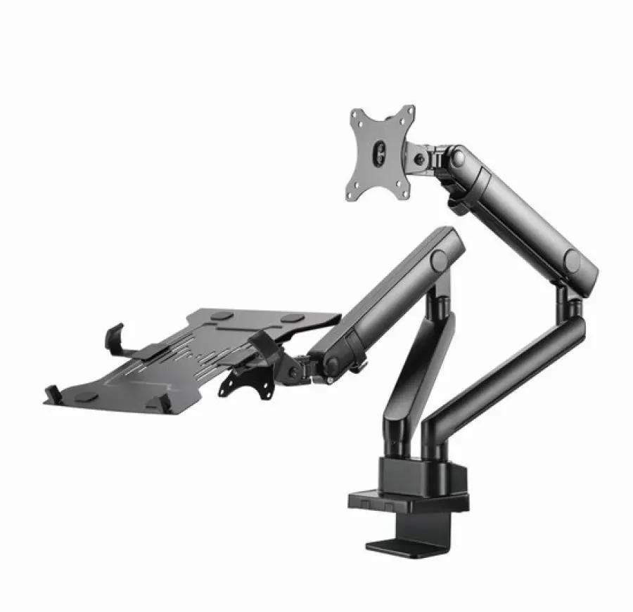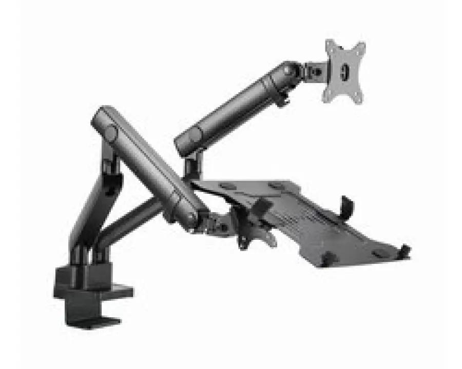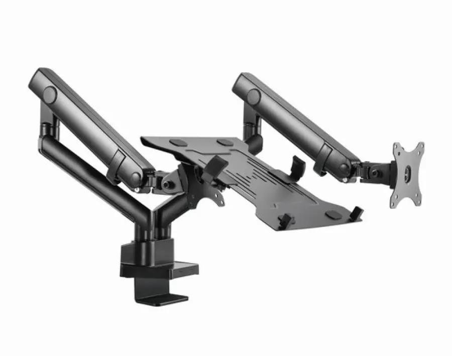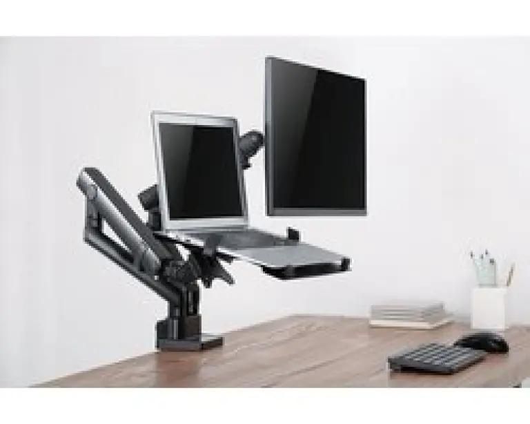De Gembird MA-DA3-02 is een praktische bureaustandaard die voorzien is van een monitorarm én een notebookstandaard. Met deze combinatie positioneer je je beeldscherm en laptop precies zoals jij wilt, zodat je altijd een comfortabele en ergonomische werkhouding hebt. De armen zijn geveerd en eenvoudig verstelbaar, waardoor je het scherm kantelt, draait en zelfs van landschaps- naar portretmodus schakelt.