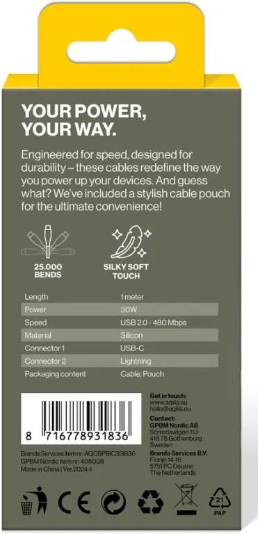 Met de Aqiila USB-C naar Lightning kabel laad en synchroniseer je je apparaten razendsnel. Dankzij het hoge laadvermogen van 60W worden je apparaten snel opgeladen. Daarnaast zorgt de synchronisatiesnelheid van 480 Mbps voor een efficiënte en snelle gegevensoverdracht, ideaal voor dagelijks gebruik.