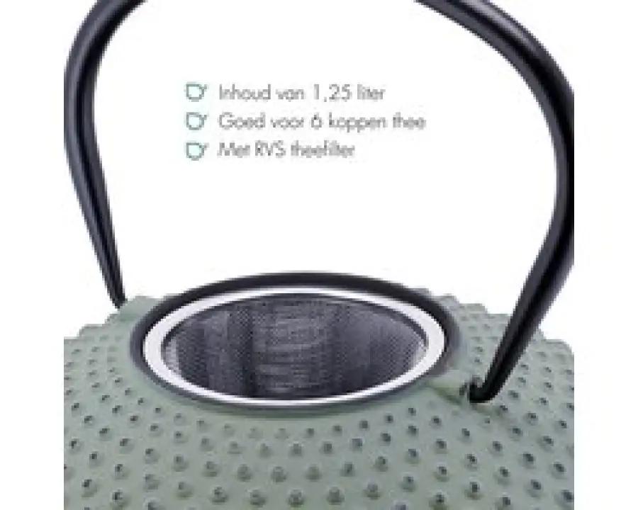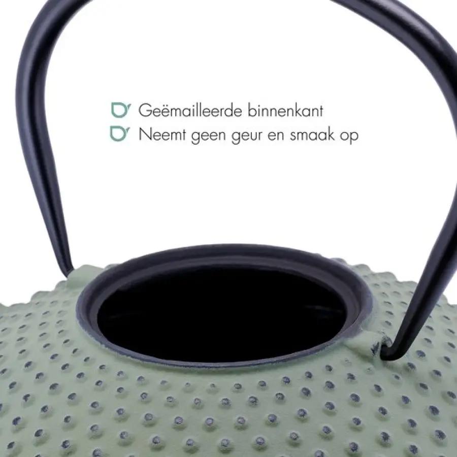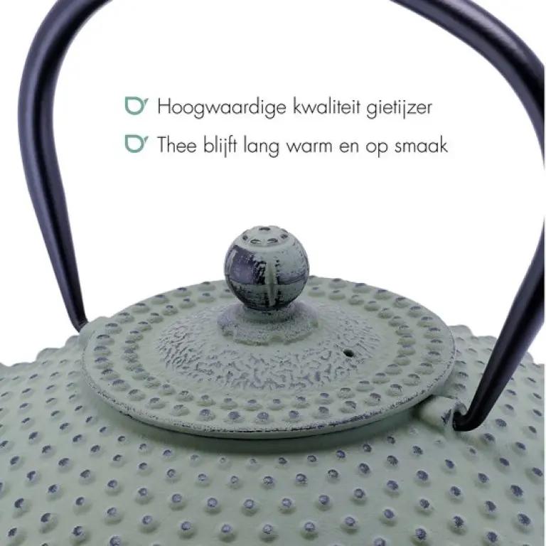 De hoogwaardige kwaliteit van het gietijzer zorgt ervoor dat je thee langer warm blijft, terwijl de geëmailleerde binnenkant roest voorkomt en de smaak van je thee intact houdt. Met een inhoud van 1,25 liter kun je 6 tot 7 koppen thee zetten, perfect voor gezellige momenten met vrienden of familie.