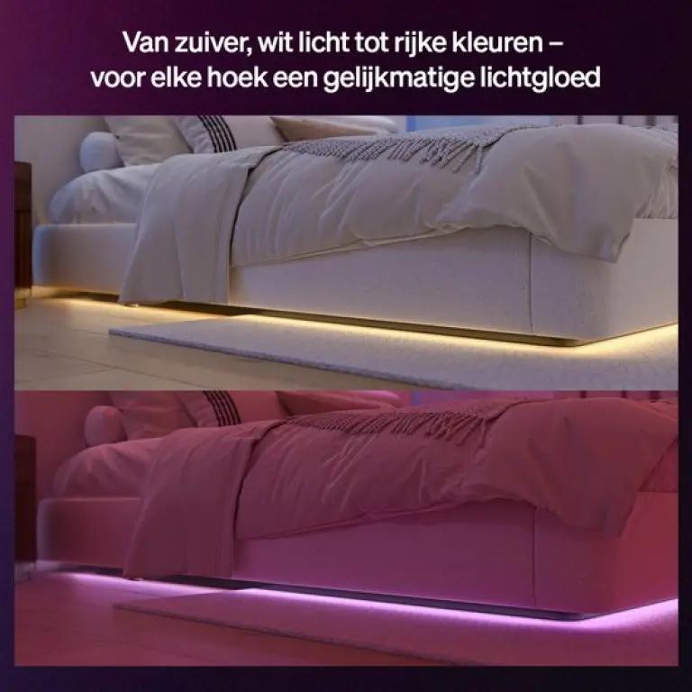 Deze lichtstrip biedt een scala aan kleuren en verschillende wit tinten, zodat je eenvoudig de juiste sfeer creëert in elke ruimte. De diffuse gloed verspreidt het licht prachtig over muren, plafonds en vloeren, waardoor je een warme en uitnodigende ambiance krijgt. Met de Chromasync™ technologie zijn kleuren nauwkeurig en consistent, wat zorgt voor een indrukwekkend visueel effect. Bovendien is de strip eenvoudig op maat te knippen, uit te breiden en flexibel te plaatsen, zodat hij perfect past in jouw huis, van muren tot trappen.