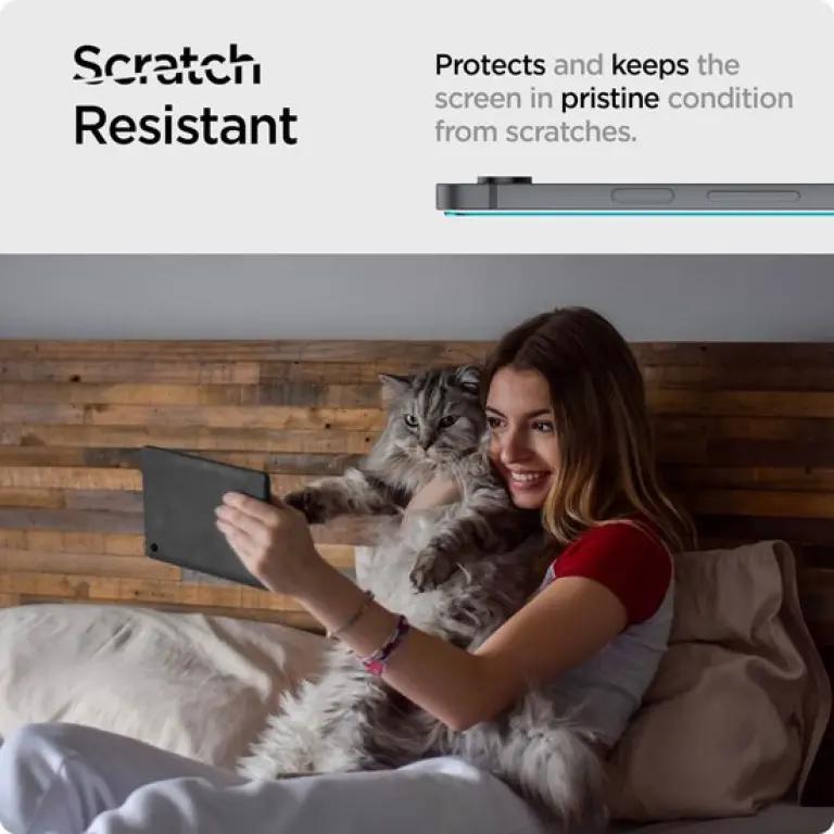 De screenprotector is eenvoudig aan te brengen op het scherm van je tablet. Dankzij het slanke design is het glas case friendly, wat betekent dat het perfect samenwerkt met hoesjes, waaronder die van Spigen zelf. Zo hoef je niet te kiezen tussen bescherming en gebruiksgemak.