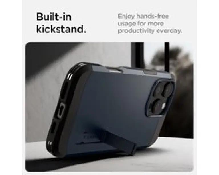 De Spigen Tough Armor AI MagFit is voorzien van een handige bureaustandaard, ideaal om handsfree video's te kijken of te videobellen. Bovendien ondersteunt de hoes draadloos opladen en is hij volledig MagSafe-compatibel, zodat je snel en eenvoudig je iPhone kunt opladen zonder de hoes te verwijderen.