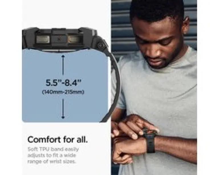 De Spigen Rugged Armor Pro band is de perfecte mix van stijl en bescherming voor je smartwatch. Gemaakt van flexibel en schokabsorberend TPU-materiaal, biedt deze band een duurzame bescherming tegen dagelijkse schade zoals krassen en vallen. Dankzij de matte afwerking met subtiele accenten krijgt je smartwatch een moderne en strakke uitstraling.