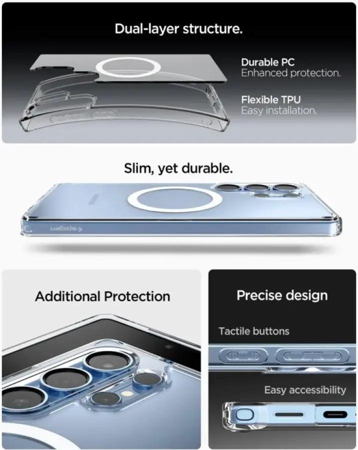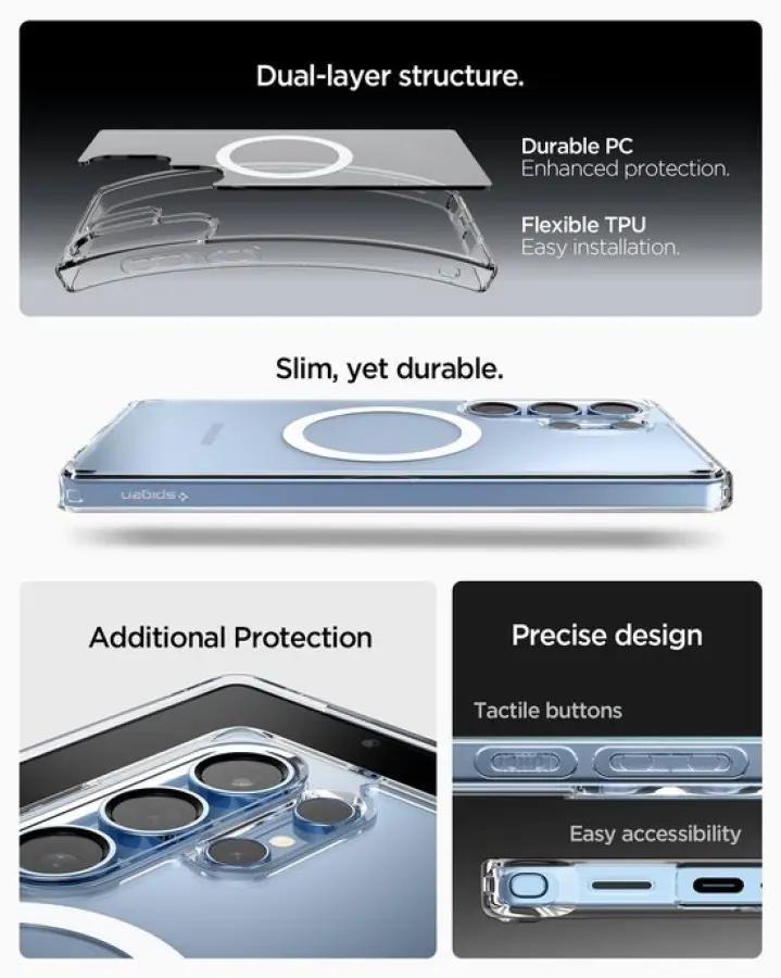 De SPIGEN Crystal Hybrid is een tijdloze klassieker die jouw Samsung Galaxy S25 Ultra beschermt tegen dagelijkse stoten zonder bulk toe te voegen. Het hoesje combineert een slanke en hybride structuur van hard polycarbonaat met een schokabsorberende TPU bumper, wat zorgt voor een stevige, maar toch lichte bescherming.